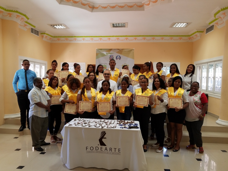 Santo Domingo, D.N.- En un acto de clausura celebrado en el Centro Cultural de la Comunidad la Descubierta, fueron entregados 29 certificados de participación a beneficiarios del “Taller de Formación Artesanal en la Técnica de Bisutería con Cuentas Secas”, impartido en La Descubierta, provincia Independencia, por la Dirección de Fomento y Desarrollo de la Artesanía (FODEARTE), en coordinación con la Dirección General de Desarrollo Fronterizo (DGDF).