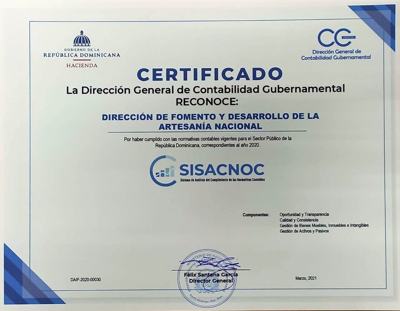 La Dirección General de Contabilidad Gubernamental (DIGECOG), otorgó a La Dirección de Fomento y Desarrollo de la Artesanía Nacional (FODEARTE) un reconocimiento por haber obtenido un Nivel Alto en el Sistema de Análisis del Cumplimiento de las Normativas Contables (SISACNOC).