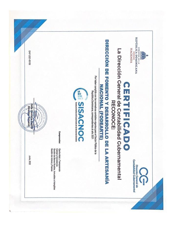 La Dirección General de Contabilidad Gubernamental (DIGECOG), otorgó a La Dirección de Fomento y Desarrollo de la Artesanía Nacional (FODEARTE) un reconocimiento por haber obtenido un Nivel Alto en el Sistema de Análisis del Cumplimiento de las Normativas Contables (SISACNOC).