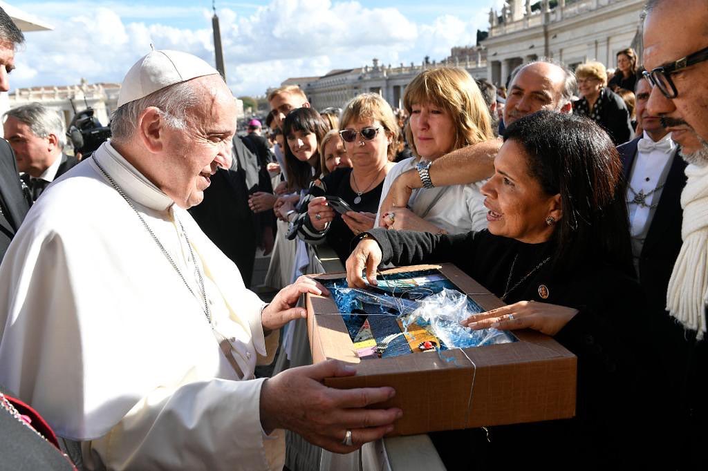 Obsequio al Papa Francisco una hermosa pieza realizada por el artesano dominicano Manuel Bolos, maestro en el arte del reciclaje; creada con materiales de desecho inspirada en el milagro de Jesús de la multiplicación de los panes y peces.