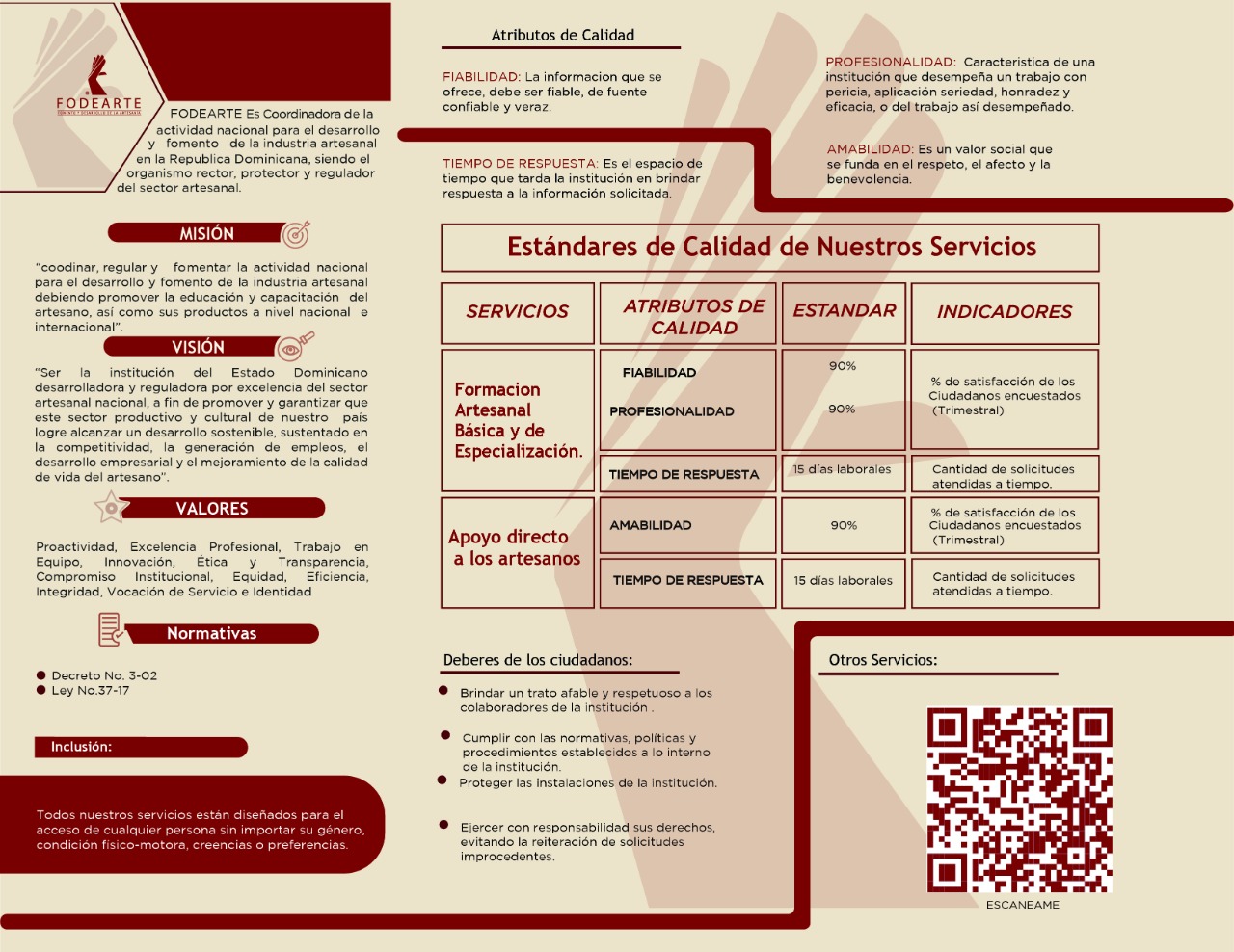 En esta carta son descritos los objetivos, normativas, servicios, derechos y deberes de FODEARTE para con el ciudadano. De igual manera, las formas de comunicación, compromisos de calidad, formas de acceso a los servicios, sistema de normalización y vías para presentar quejas, denuncias reclamaciones y sugerencias.
