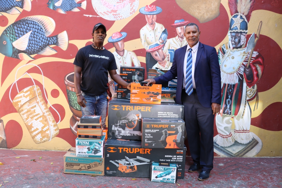 Las herramientas fueron entregadas por el Director General de FODEARTE, el maestro y artesano Ramón Guillén, al artesano en las instalaciones de la institución, en compañía de la Directiva de Centrocámara-RD, la cual es presidida por Kathy Grullón, quien se hizo acompañar de la vicepresidenta de la cámara, Luisa Abinader, y de la directiva y consultora Katrina Naut.